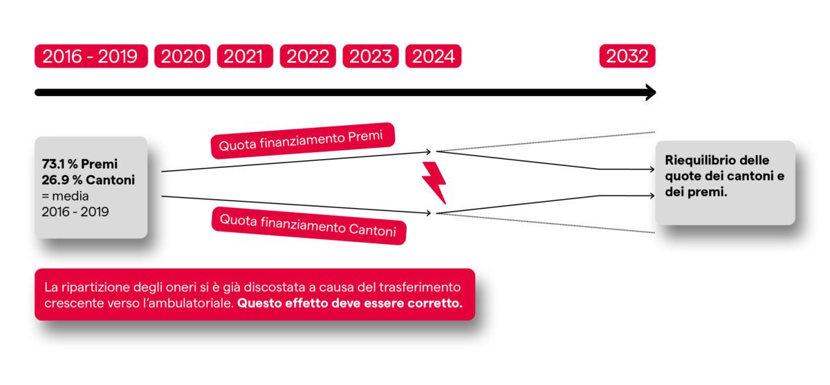 Anche se di norma le cure ambulatoriali sarebbero più economiche, la diversa ripartizione dei costi fa sì che le cure ambulatoriali siano più costose per le assicurazioni malattie e di conseguenza per gli assicurati. La ragione di questa discrepanza è dovuta al fatto che gli assicurati sostengono l’intero onere dei costi del settore ambulatoriale. Di conseguenza, attualmente solo il Cantone beneficia di cure ambulatoriali più economiche: non paga nulla, mentre gli assicurati pagano tutto. La riforma corregge questo errore. Pone fine ad una distribuzione sempre più iniqua dei costi tra il Cantone e assicurati e promuove l’indiscussa necessità di cure ambulatoriali.